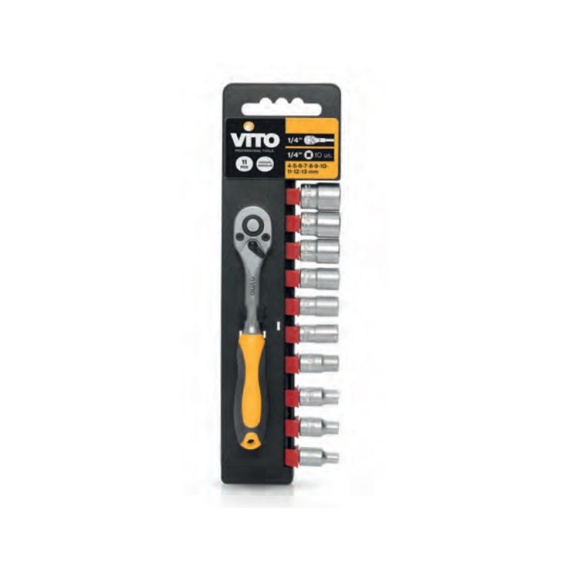 Contenuto: 1 cricchetto reversibile da 1/2". 10 bussole da 1/2": 4-5-6-7-8-9-10-11-12-13 mm.