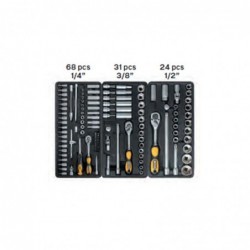 Carrello da officina completo, 221 pezzi in cromo vanadio di alta qualità con cilindro di sicurezza, serratura e 2 chiavi. Superficie con distribuzioni, resistente agli oli e ai prodotti chimici. Ogni cassetto è dotato di cuscinetti flessibili, di una portata di 35 kg e di un sistema di chiusura e sicurezza. Ruote con possibilità di bloccaggio e facile accesso al freno. Ruote in gomma di diametro extra large.