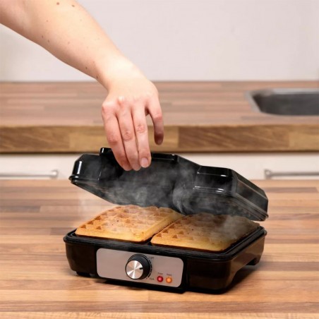Dotata di rivestimento antiaderente, spia luminosa e manico robusto, questa piastra per waffle garantisce un'esperienza di cottura ottimale e sicura.