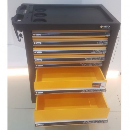 Il carrello da officina professionale a 7 cassetti VITO è progettato per un uso professionale La sua struttura rinforzata è resistente agli urti e agli oli. Dotato di un sistema di chiusura centralizzata con serratura per riporre in sicurezza gli attrezzi e gli effetti personali - Dotato di 2 ruote in gomma diametro 125 mm + 2 ruote posteriori piroettanti con freno per un facile spostamento anche a pieno carico - Composto da 5 cassetti altezza 65 mm, portata 25 kg + 1 cassetto altezza 135 mm portata 35 kg + 1 cassetto altezza 205 mm portata 35 kg Il suo vassoio superiore di 685 x 465 mm è un utile e pratico piano di lavoro per armeggiare o mettere una morsa. È dotato di un rivestimento in PVC gommato antiscivolo, che vi aiuterà a posizionare le vostre apparecchiature elettriche portatili o gli articoli di ferramenta in modo da poter lavorare comodamente come un mini banco da lavoro. Lati forati per riporre ulteriori pezzi o ganci. Cassetti scorrevoli con guide a sfera. Dimensioni: 770 x 465 x 970 mm Peso: 29 kg